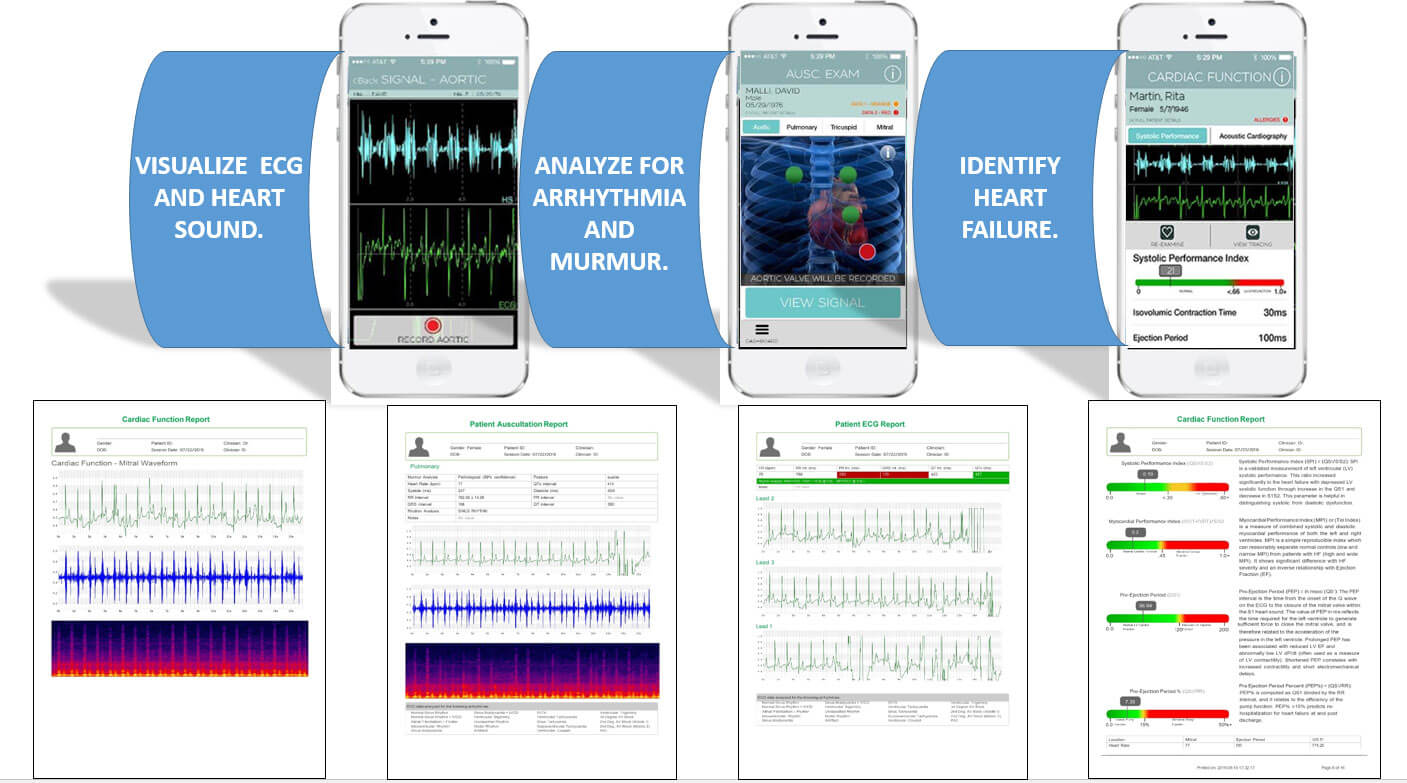 Synchronized Digital Auscultation with ECG allows for visualized heart sound and Murmur Detection.